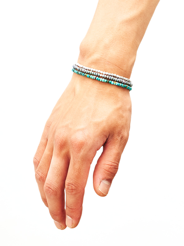 種類の異なる素材を1本のワイヤーで連ねたBRACELETS(ブレスレット)。SILVER(シルバー)、ブラックパールにブラックスピネル、ブルーのラピスラズリ、ブラウンのタイガーアイ、グリーンのターコイズと天然石をそれぞれ組み合わせ、素材の持つ色味と質感のコントラストにより手軽にブレスレットのレイヤード感を出すことができます。