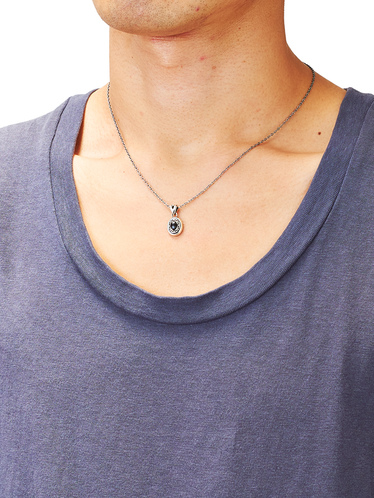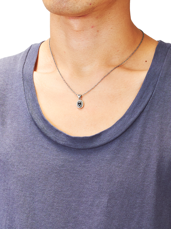 オーバル状のトップ中央部に多面体カットを施した天然石をセットし、石の周囲にジオメトリックモチーフの彫刻を施したシルバー素材のネックレス。ソリッドかつモダンなトップ部のデザインに調和するように、バチカンにもさりげないデザインが施されたネックレスです。