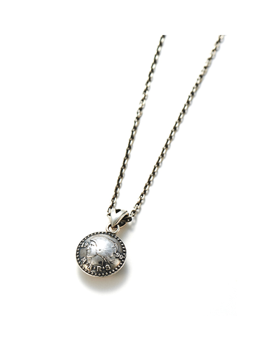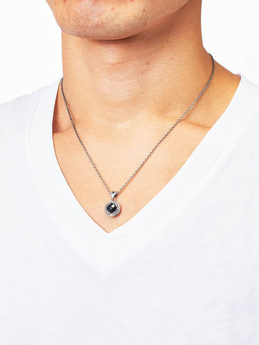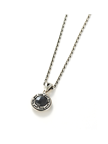 トップ中央部に多面体カットを施した天然石をセットし、石の周囲にジオメトリックモチーフの彫刻を施したシルバー素材のネックレス。トップ裏面はコインの彫刻が施されたリバーシブル仕様。ソリッドかつモダンなトップ部のデザインに調和するように、バチカンにもさりげないデザインが施されたネックレスです。