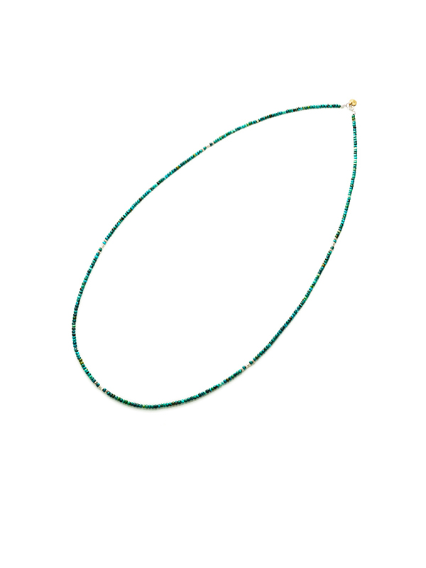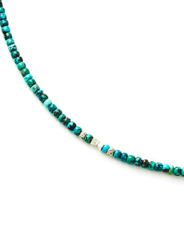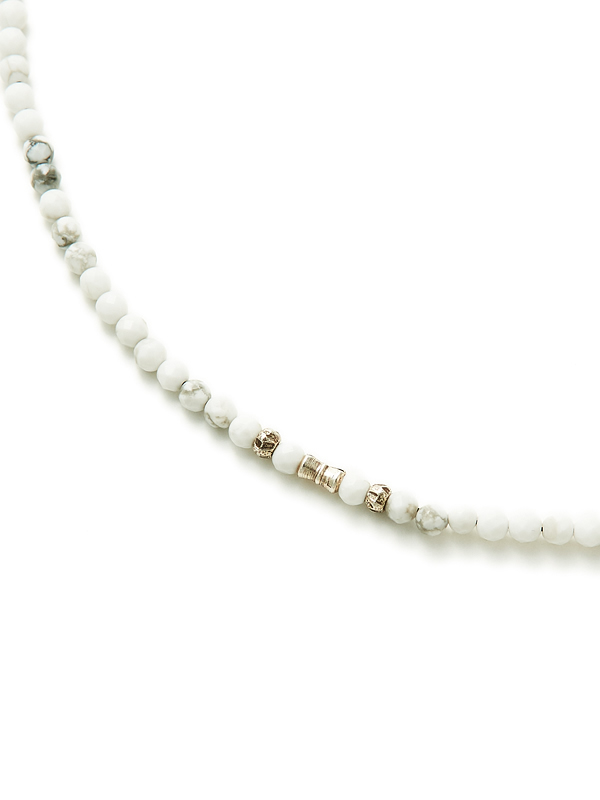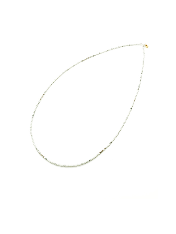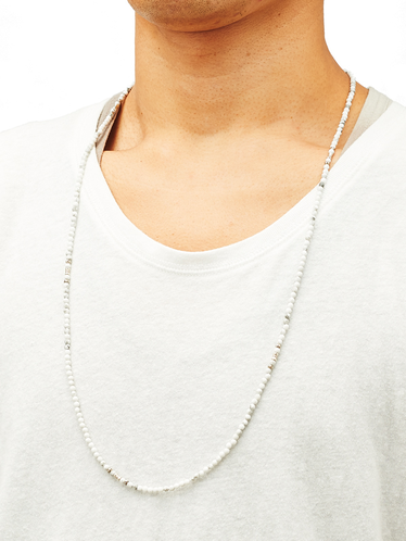ロングネックレスならではのシルエットと天然の石が持つ色味と素材感で、コーディネートのアクセントとして活躍するアイテムです。また、お手持ちのネックレスとの重ね付けがしやすいシンプルなデザインとなっています。ターコイズ、ハウライトの2色よりお選びください。