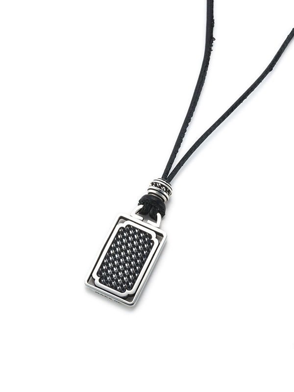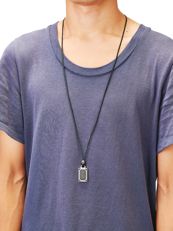 M・A・R・Sを代表するデザインであるCOMPOSIT SERIES(コンポジットシリーズ)のモーゼスネックレス。シルバーにイブシ加工を施しコンポジットの編み目を黒くし陰影を出しています。ドックタグをモチーフに、両面カスタマイズが出来リバーシブルにご利用頂けます。革ヒモは1mあり、お好みの長さで結んで調整して頂きご使用ください。