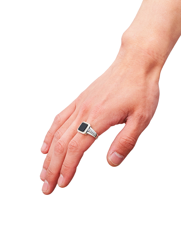 オニキスを印台部分にセットしたシグネットリングで、トップ部分から両端へユイットがデザインされています。